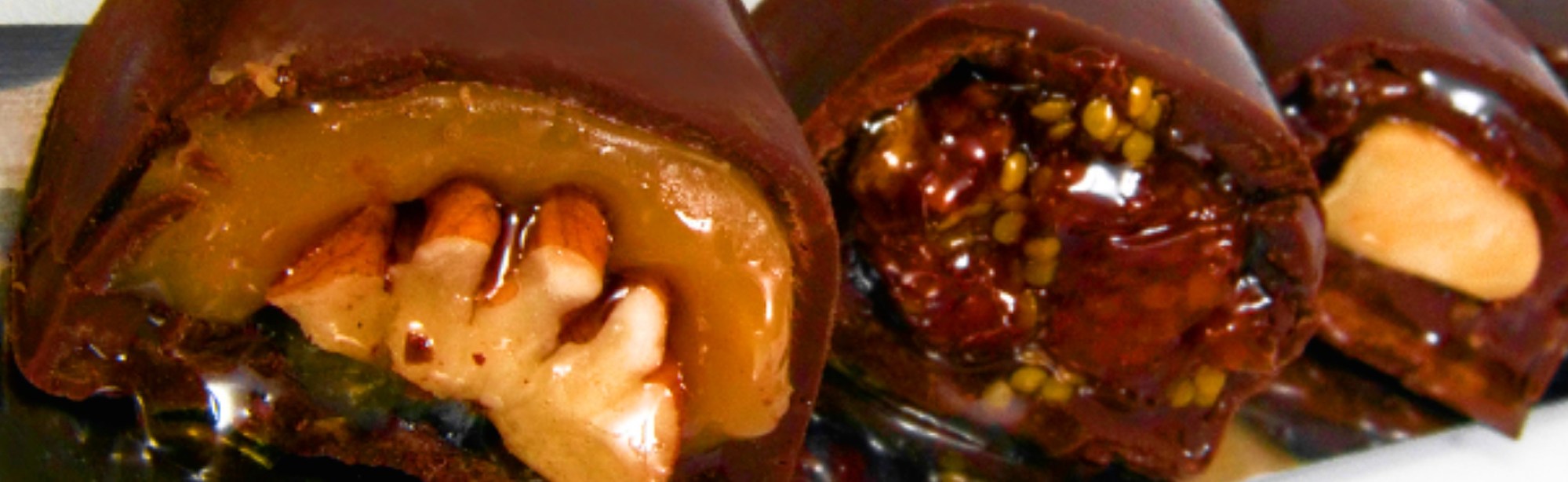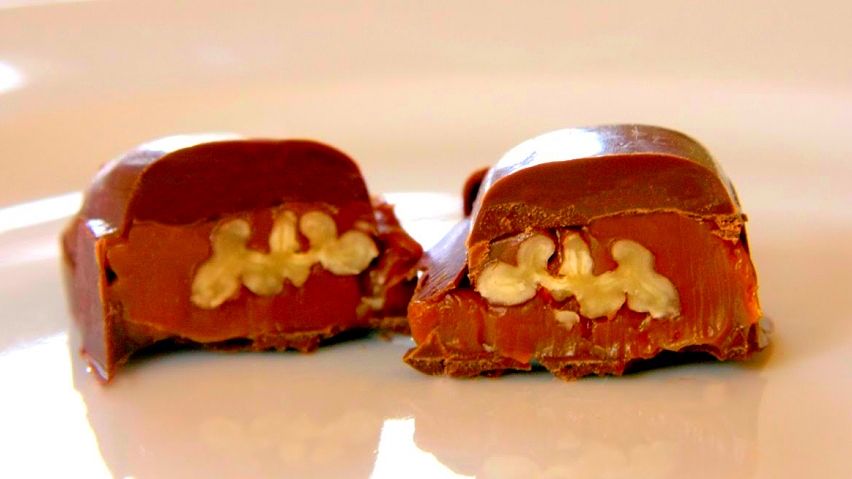 Luego se espera a que seque el chocolate, o colocarlo en la refrigeradora por unos breves minutos. Cuando esté listo, se agrega la pecana picada y se cubre con manjar. Al terminar de colocar el relleno, se pone una última capa de chocolate que tape todo el relleno y se refrigera por cinco minutos.